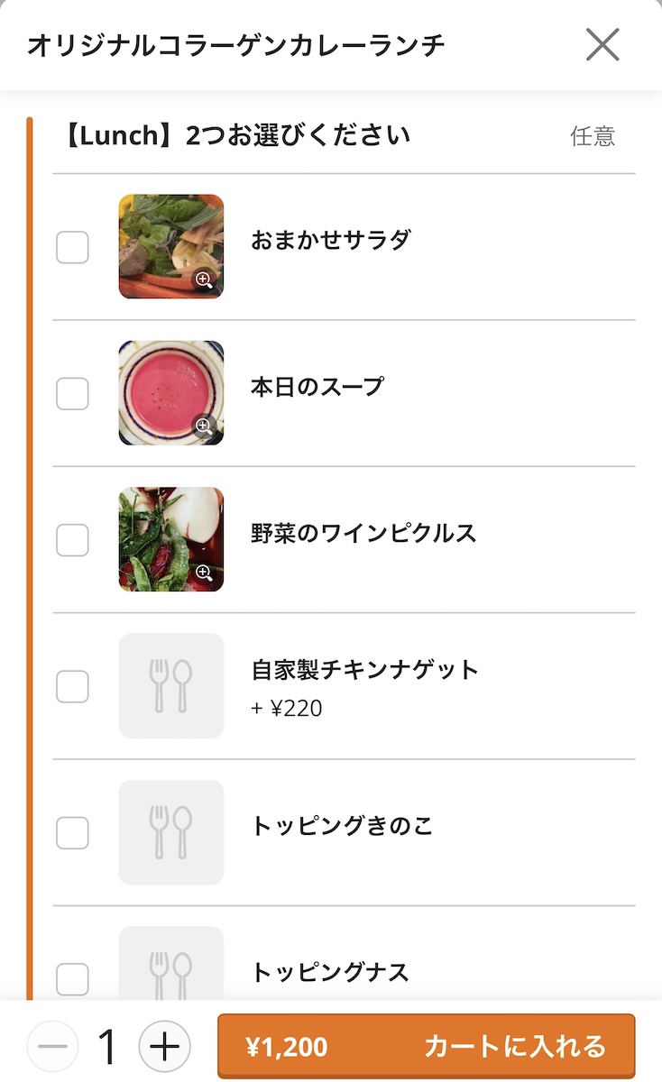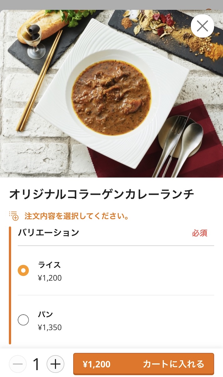 注文は、人気NO. 1のオリジナルコラゲンカレーのセット(¥1,200)。
