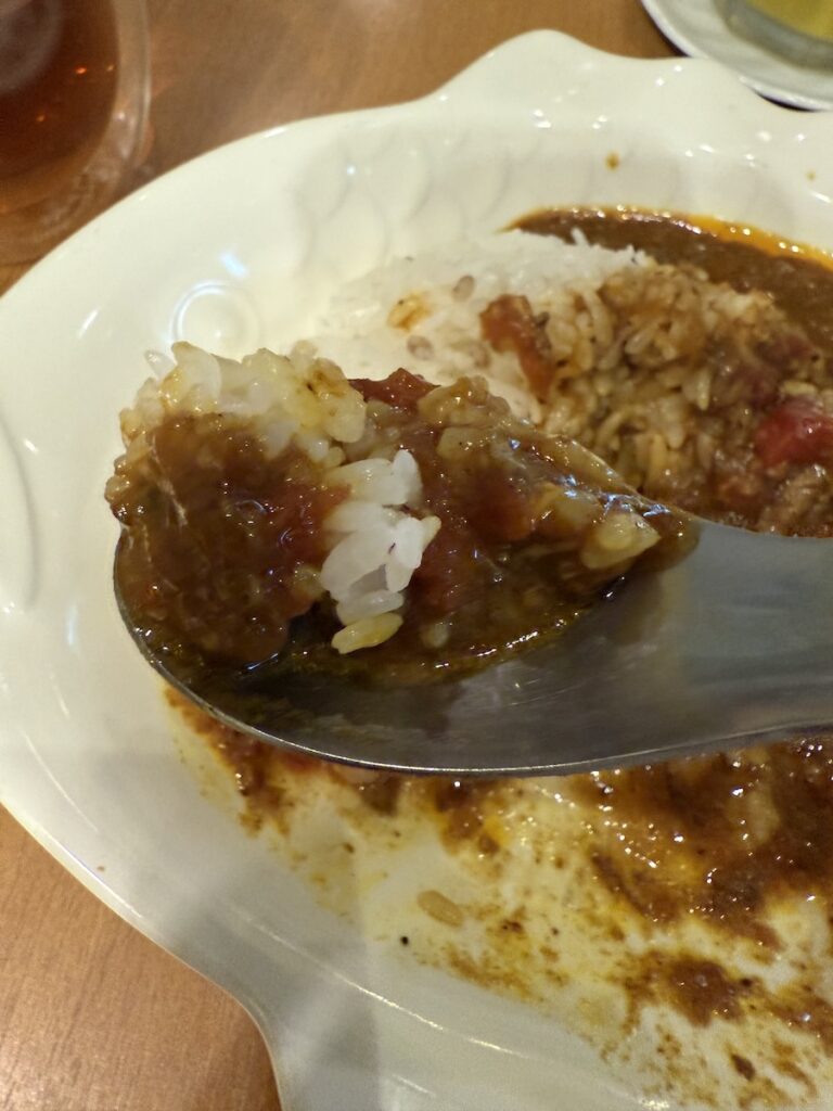 ルーは牛すじとトマトベースで、牛の甘味とトマトの酸味が混ざり合う優しい味わいです。