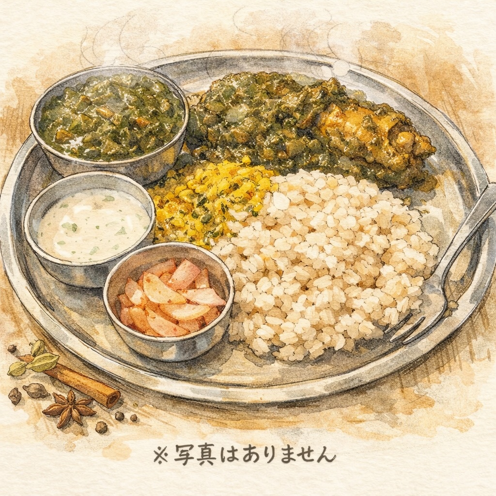 緑の青菜の旨味とスパイスが一体になった風味が、サグカレーの大きな魅力です。