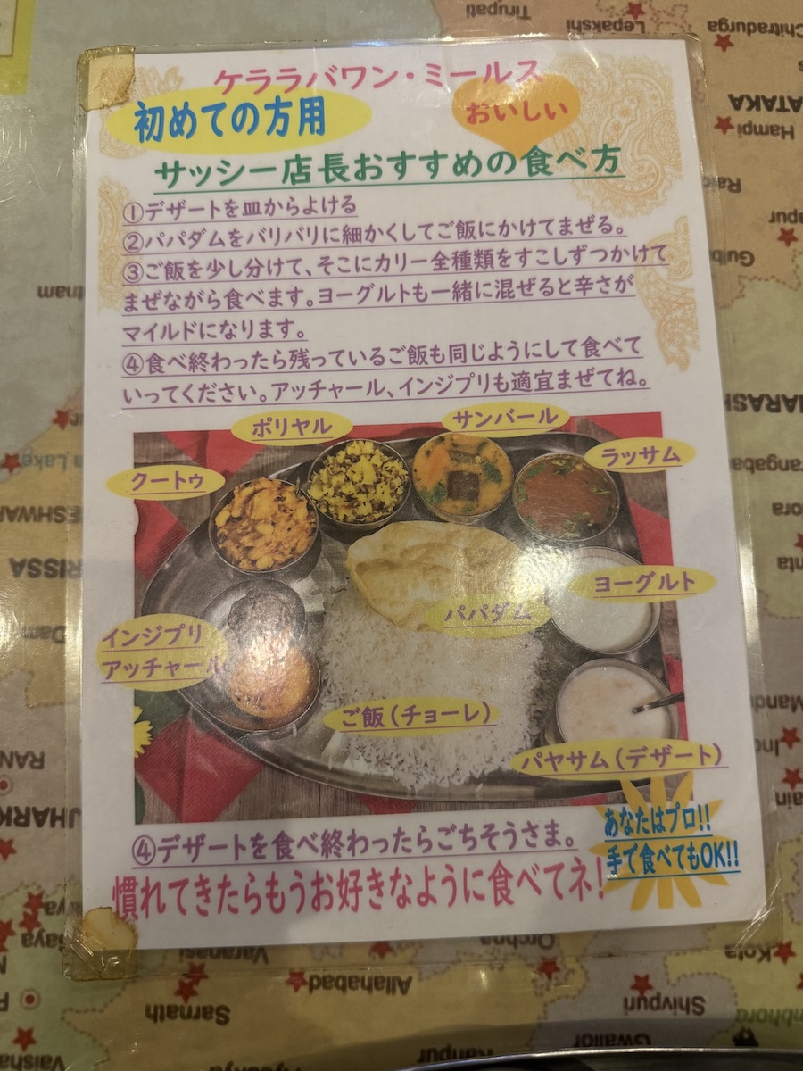店内には「ケララバワン・ミールス 初めての方用 サッシー店長おすすめの食べ方」という説明シートも用意されています。
