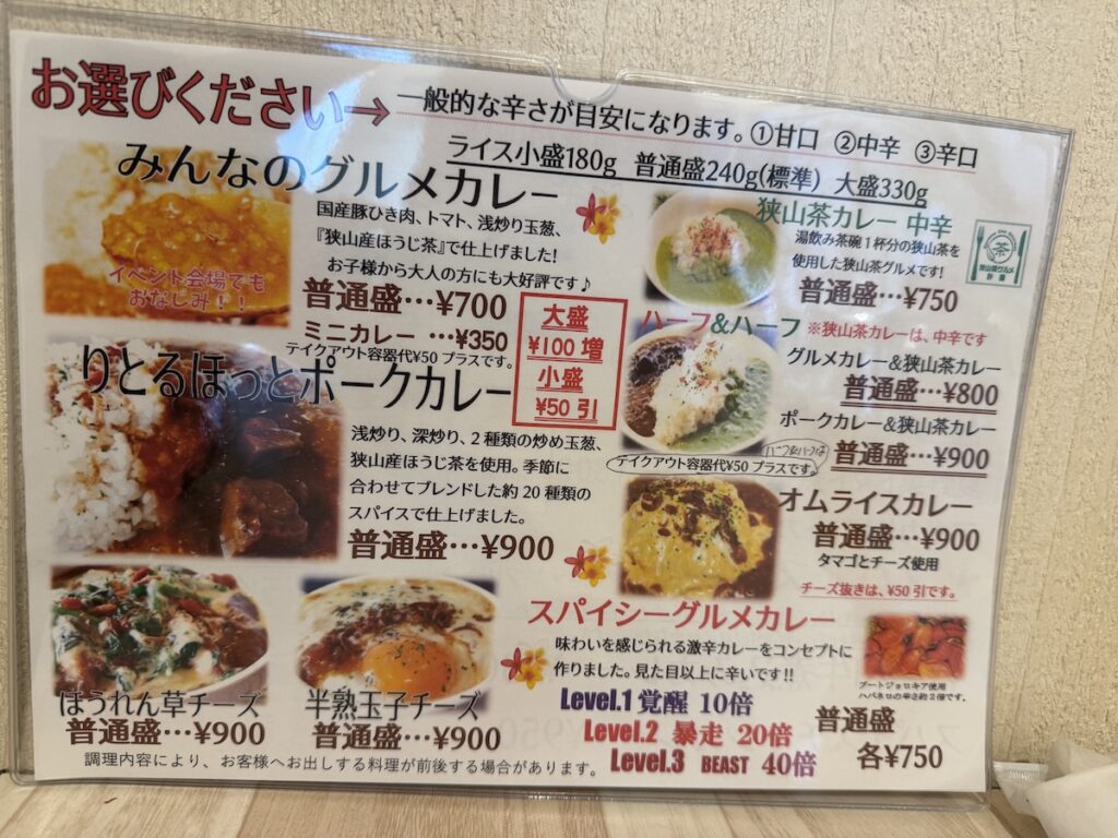 メニューには、狭山産のほうじ茶や狭山茶が使われたカレーが並びます。