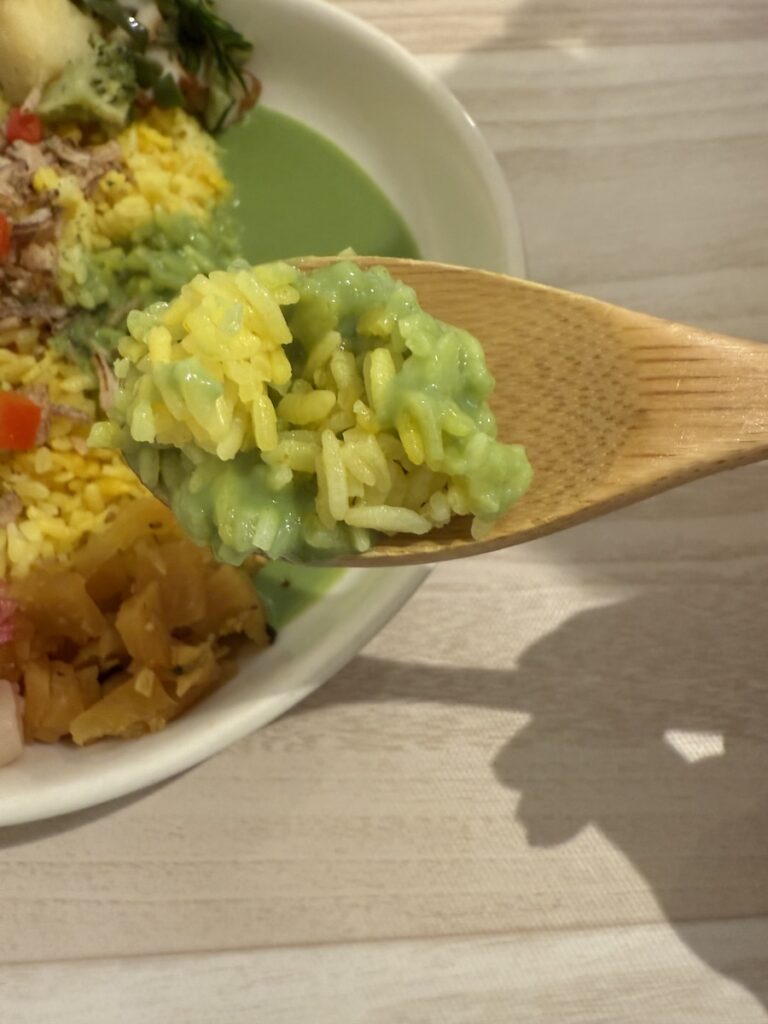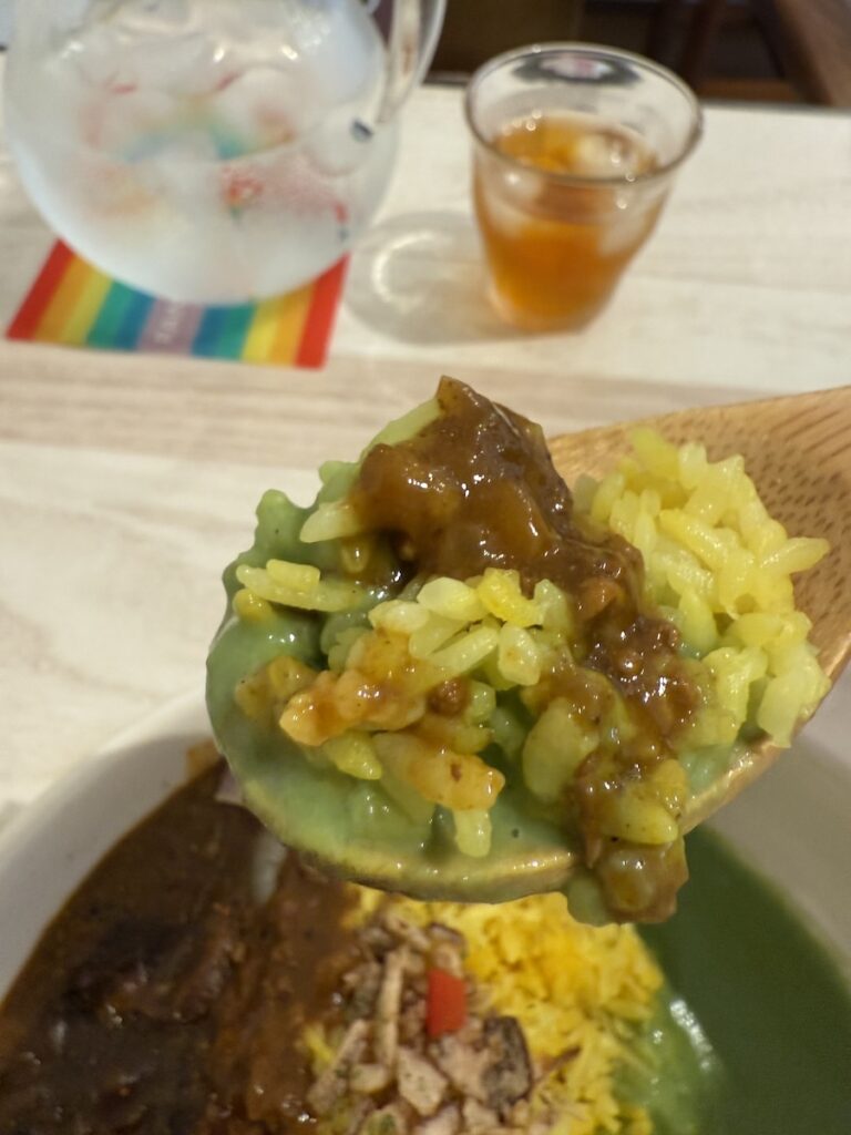 境目を少量ずつ馴染ませて「7:3 → 5:5 → 3:7」と配分を変えて、狭山茶カレーのミルキーさとポークカレーの辛さの塩梅を変化させて楽しみました。