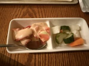 前菜として2連の仕切り小皿にサラダとピクルスが提供されました。