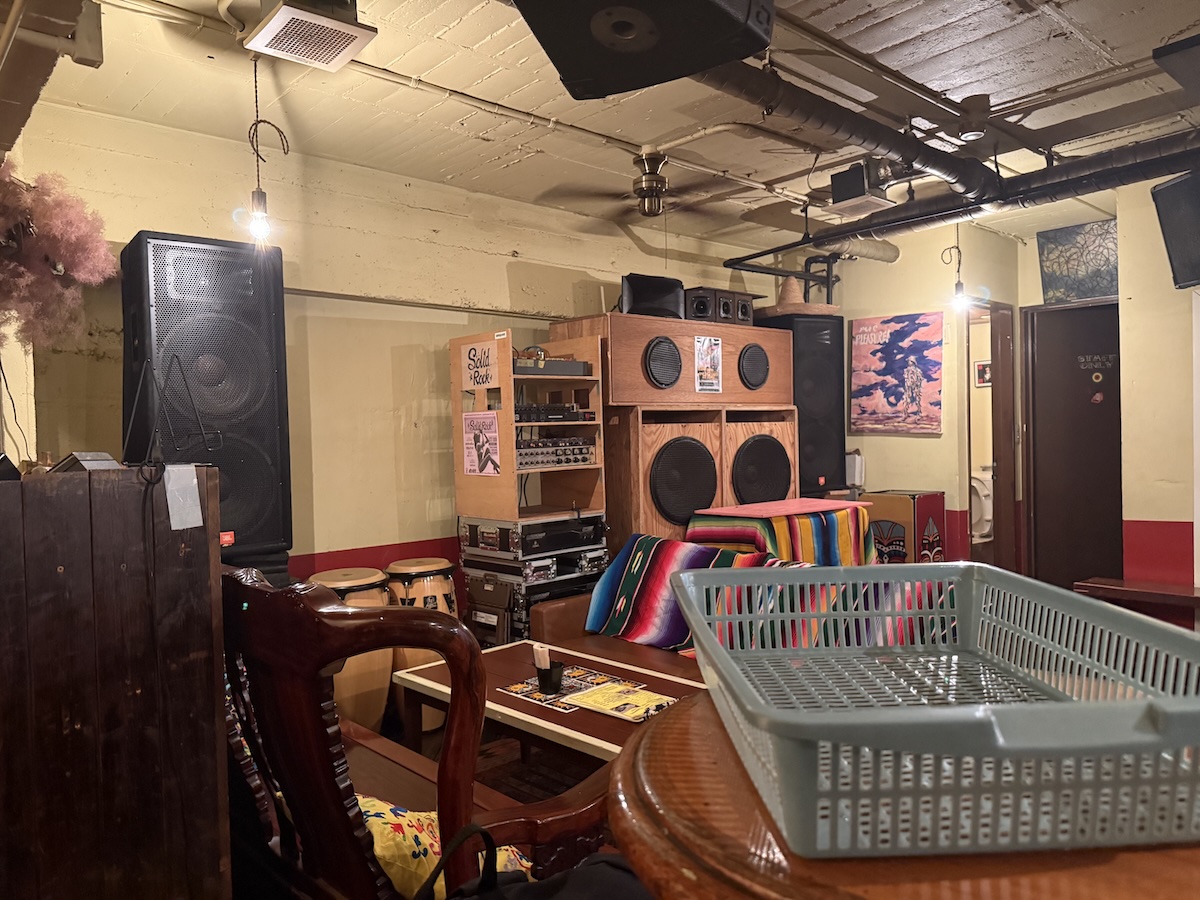 店内の奥には、大きなスピーカーや音響機材が並んだスペースがあり、夜のミュージックバーとしての雰囲気も感じられます。