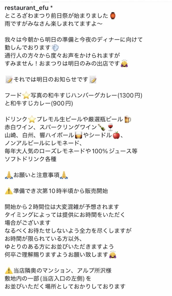 ちなみに、レストランの公式Instagramにも、以下のように長蛇の列になることが書いてありました。