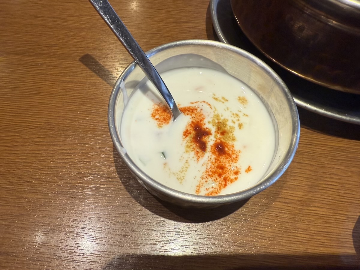 副菜として添えられたヨーグルトベースのライタが、味の変化に大きな役割を果たします。