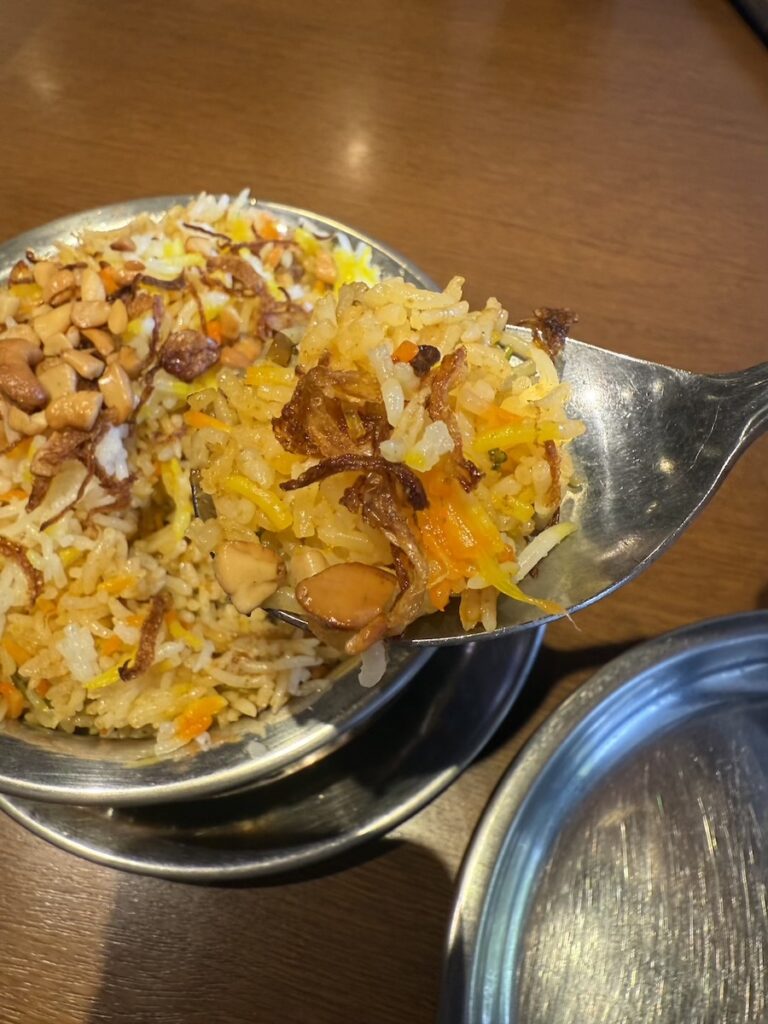 スパイスの香りが立ちのぼり、ナッツの香ばしさとオニオンフライの甘さがアクセントになっています。
