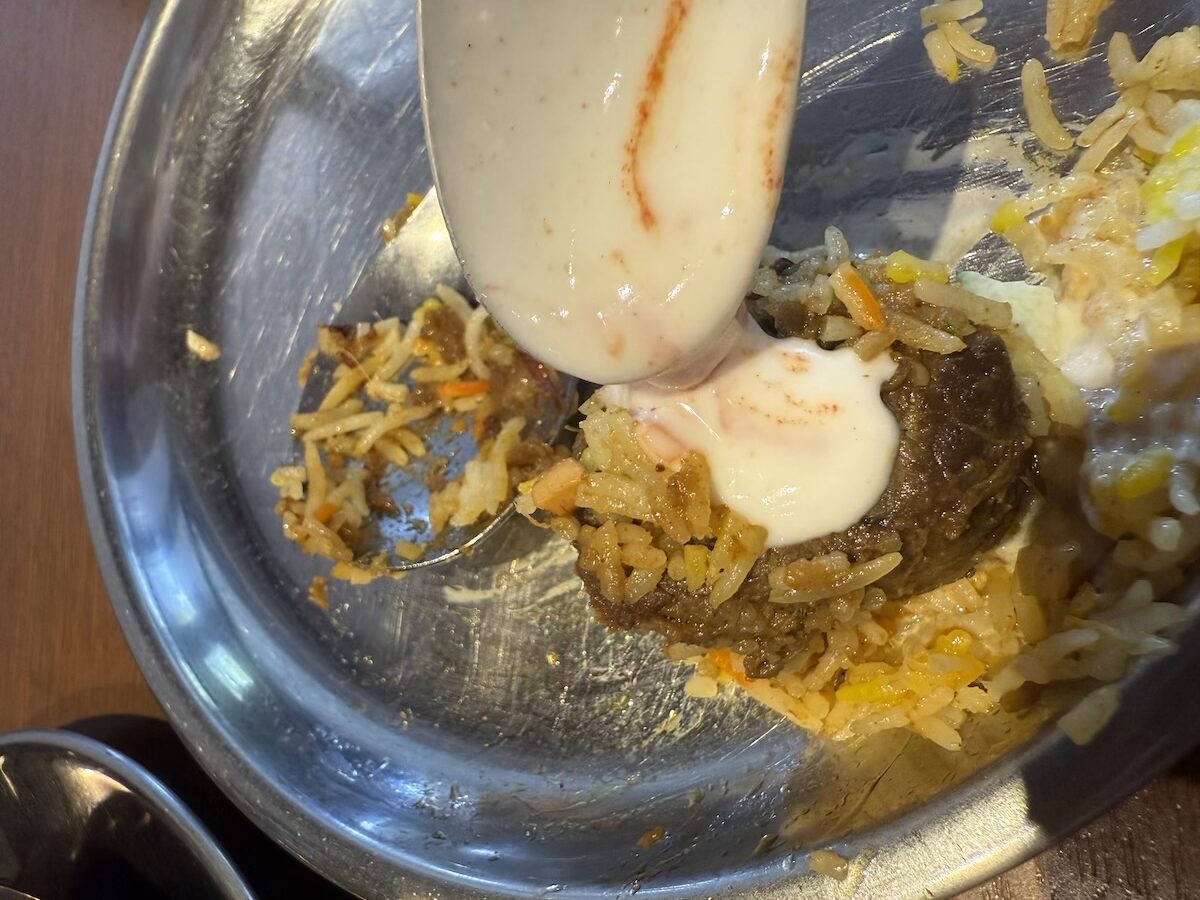 ライスの下からごろごろ登場するマトン、スパイス香る風味、そしてライタで味わいが変わる“二度美味しい”仕掛け。