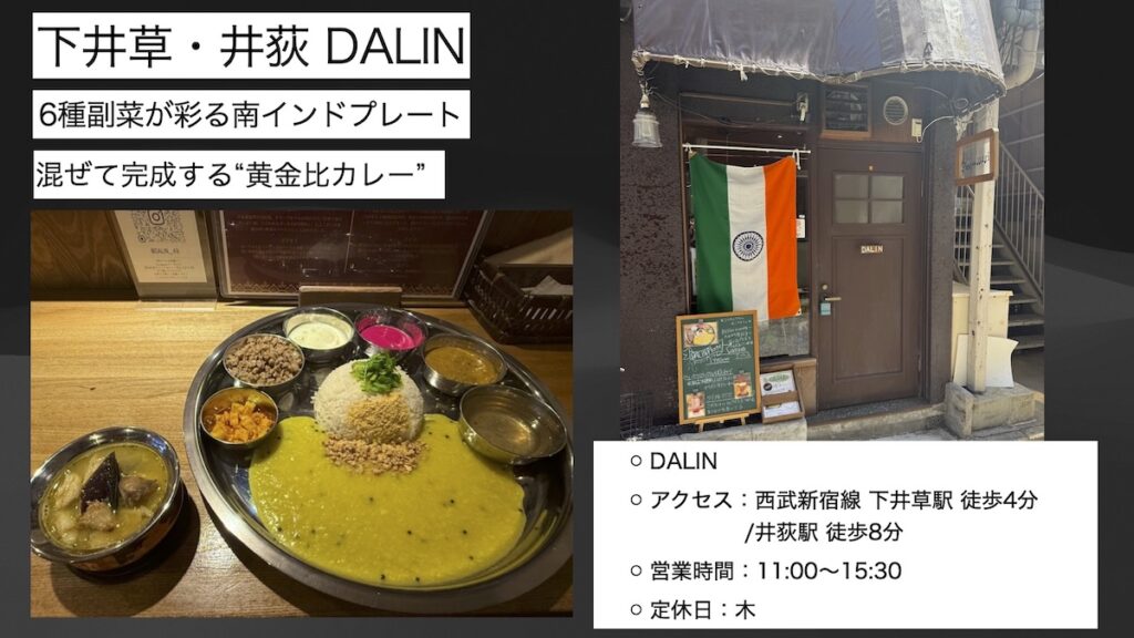 これまで巡ったカレーの中でも、ひときわ印象に残ったのが、この鮮やかな南インドプレート。最初は副菜それぞれの味を楽しみ、最後はすべてを混ぜ合わせる。自分だけの「黄金比」を探しながら食べ進める時間は、DALINならではのスパイス体験です。