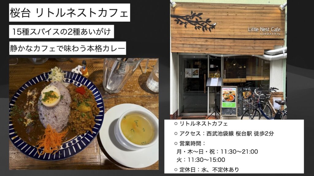 30軒以上を巡ってもなお、西武線沿線にはまだ知られていない魅力的なカレーが点在していると感じています。 子供の頃から変わらず私を惹きつけてやまないカレー。大学生の頃の「ネタ」だったカレー好きは、今や人生を豊かにしてくれる大切なスパイスとなりました。