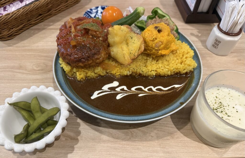 日替りカレーのセットには、チーズインハンバーグ・ピーマン肉味噌・カボチャサラダ・ベイクドポテトが盛られ、冷製じゃがいもポタージュ・枝豆も添えられ、副菜も賑やかに並びます。