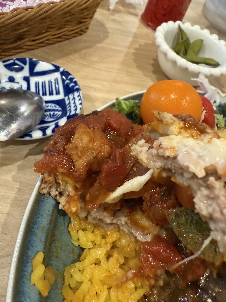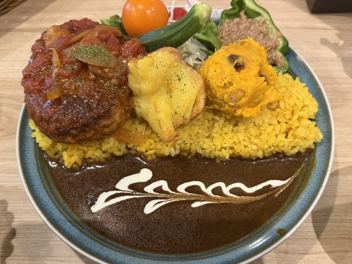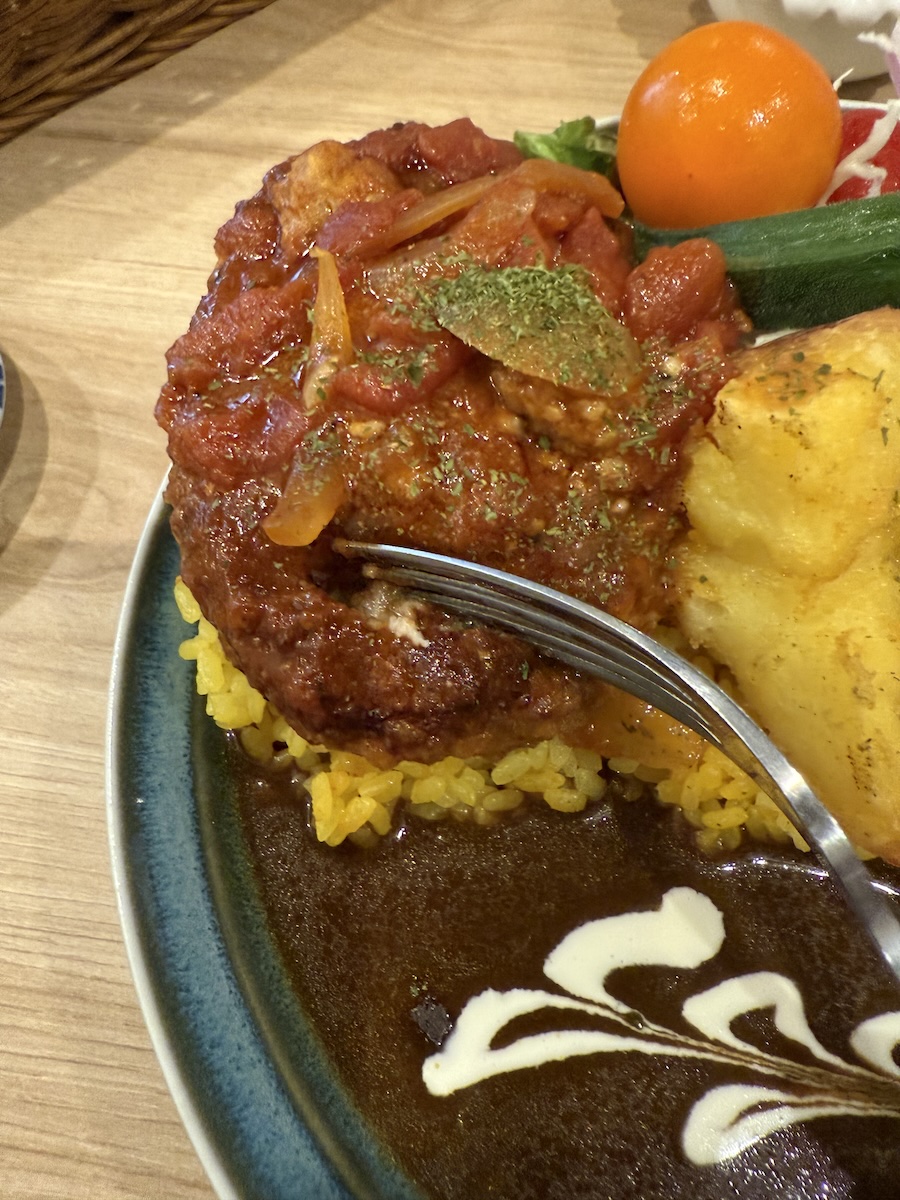 チーズインハンバーグはジューシーで、カレーとのコラボも抜群😊