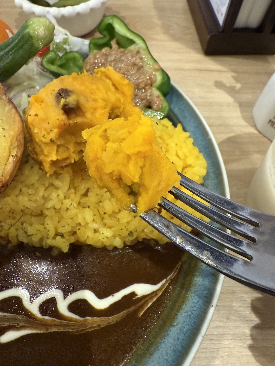 カボチャサラダはナッツ、レーズン入りで、カボチャの柔らかい甘さで、辛口ルーの口休めにぴったり。